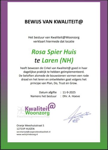 Het Rosa Spier Huis laat zich graag toetsen. Dit houdt ons scherp en geeft ons steeds weer inspiratie om te leren en verbeteren. Wij zijn trots te kunnen zeggen dat wij de Cirkel van Kwaliteit Audit in 2025 met goed gevolg afgelegd hebben. Klik hier voor het ‘Bewijs van Kwaliteit’.